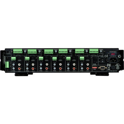 Each zone has a Mute Trigger IN that will mute zone audio when voltage is present on the Mute Trigger IN. When the voltage is cut, the zone audio output resumes.